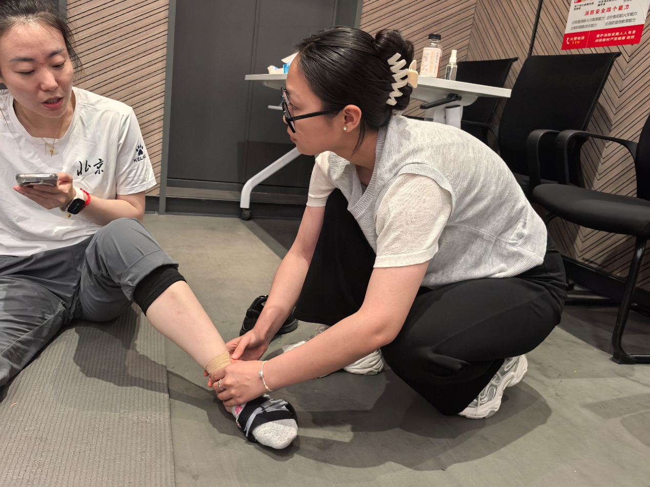 “广播体操看似动作基础,但长期重复训练易导致肌肉疲劳与关节劳损,专业康复保障必须跟上。”保障团队负责人介绍。为匹配代表队的训练节奏,团队特意采用“两人一组”的分组模式,将8名成员划分为4个工作小组,实现每日训练时段的全时段在岗覆盖。从训练基地的器材室到训练场边的临时保障点,同学们的身影始终活跃在队员最需要的地方,用规律的值守和细致的服务赢得了队伍的信任。截至保障工作结束,这支平均年龄不足19岁的团队累计服务时长超 110小时,消耗肌贴20余卷,处理急性扭伤、肌肉痉挛等轻微损伤40余起。“他们就像训练场上的‘移动医疗站’,有他们在,我们训练更安心,也只有他们,见证了我们的坚持。”一位北京代表队队员的话语道出了队员们的心声。