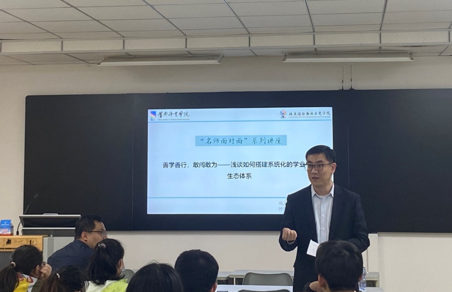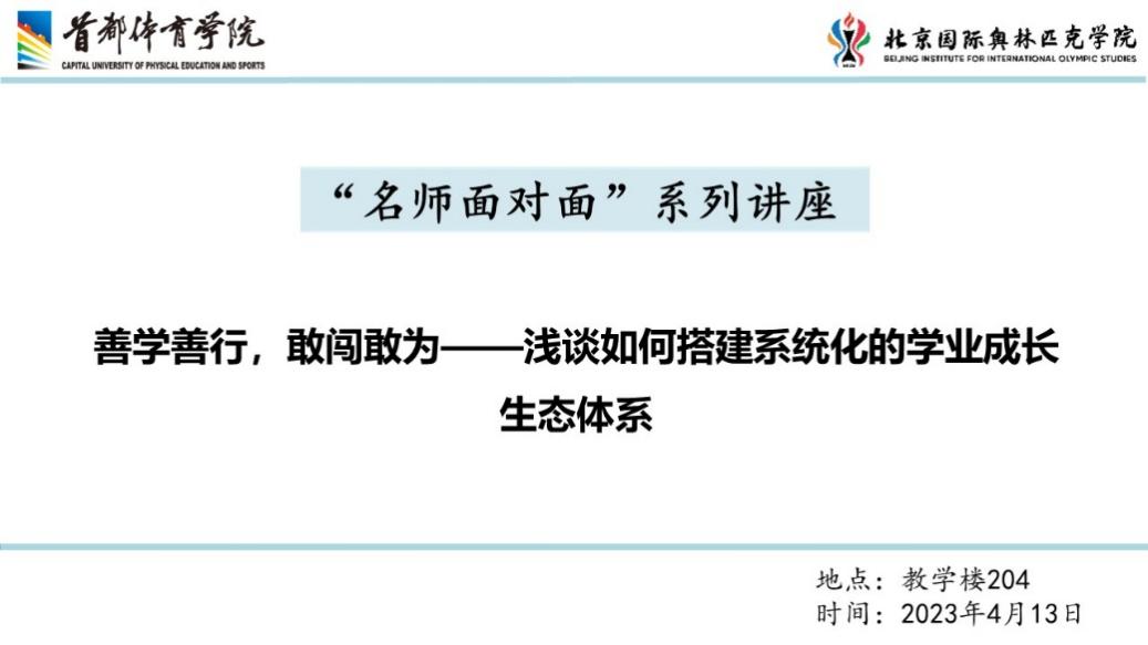 2023年4月13日下午,肉视频 举办“名师面对面”系列讲座第二讲:善学善行,敢闯敢为——浅谈如何搭建系统化的学业成长生态体系。本期讲座由体医融合创新中心陈煜教授主讲,学院党委书记翟伯晨、院长贺刚及学院师生参加讲座。讲座由贺刚院长主持。