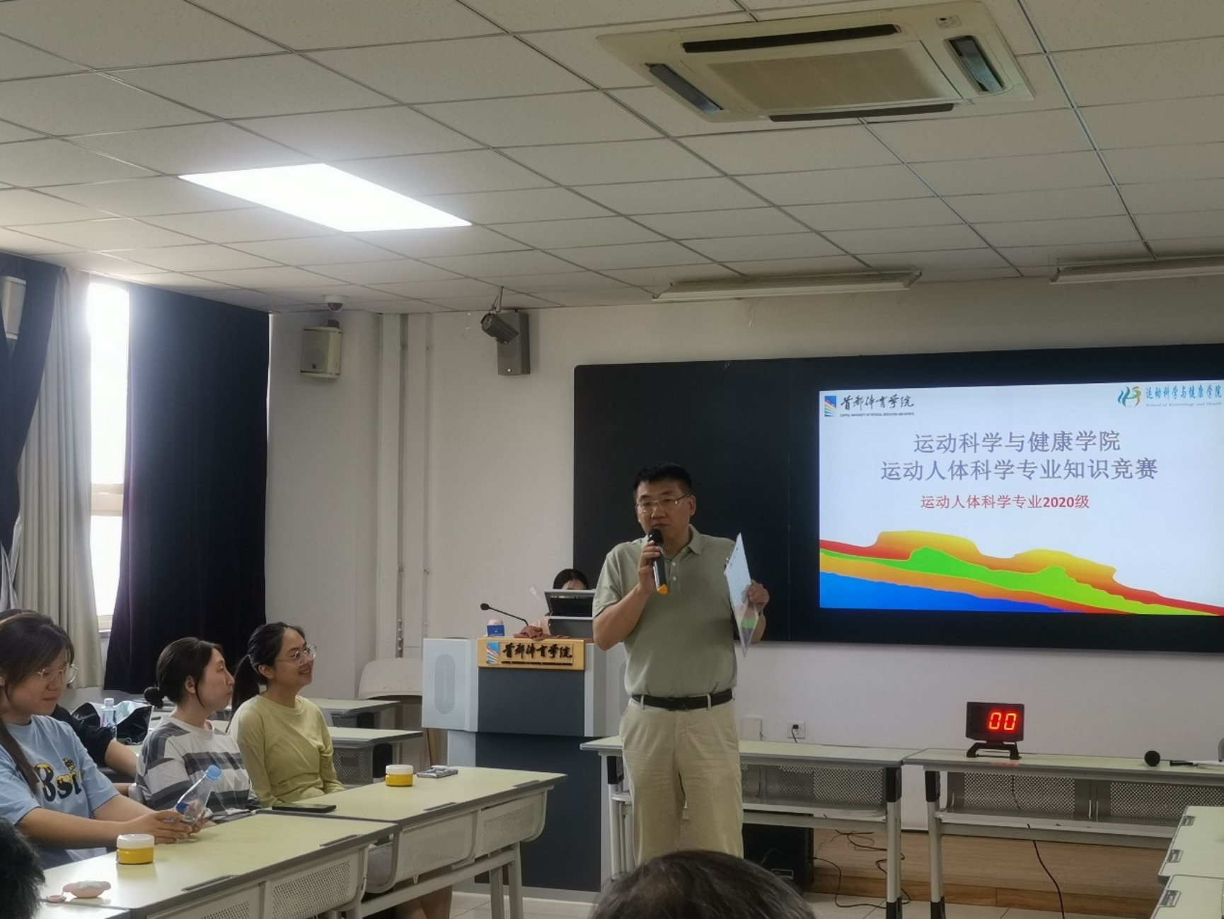 6月15日下午,肉视频 于教学楼407教室组织召开运动人体科学专业2020级学生专业知识竞赛。竞赛邀请健康管理教研室季钢、王超、陈佑学三位老师担任评委,运动人体科学专业2020级全体学生参赛,运动人体科学专业2022级学生现场观摩,竞赛由杨少峰副院长主持。