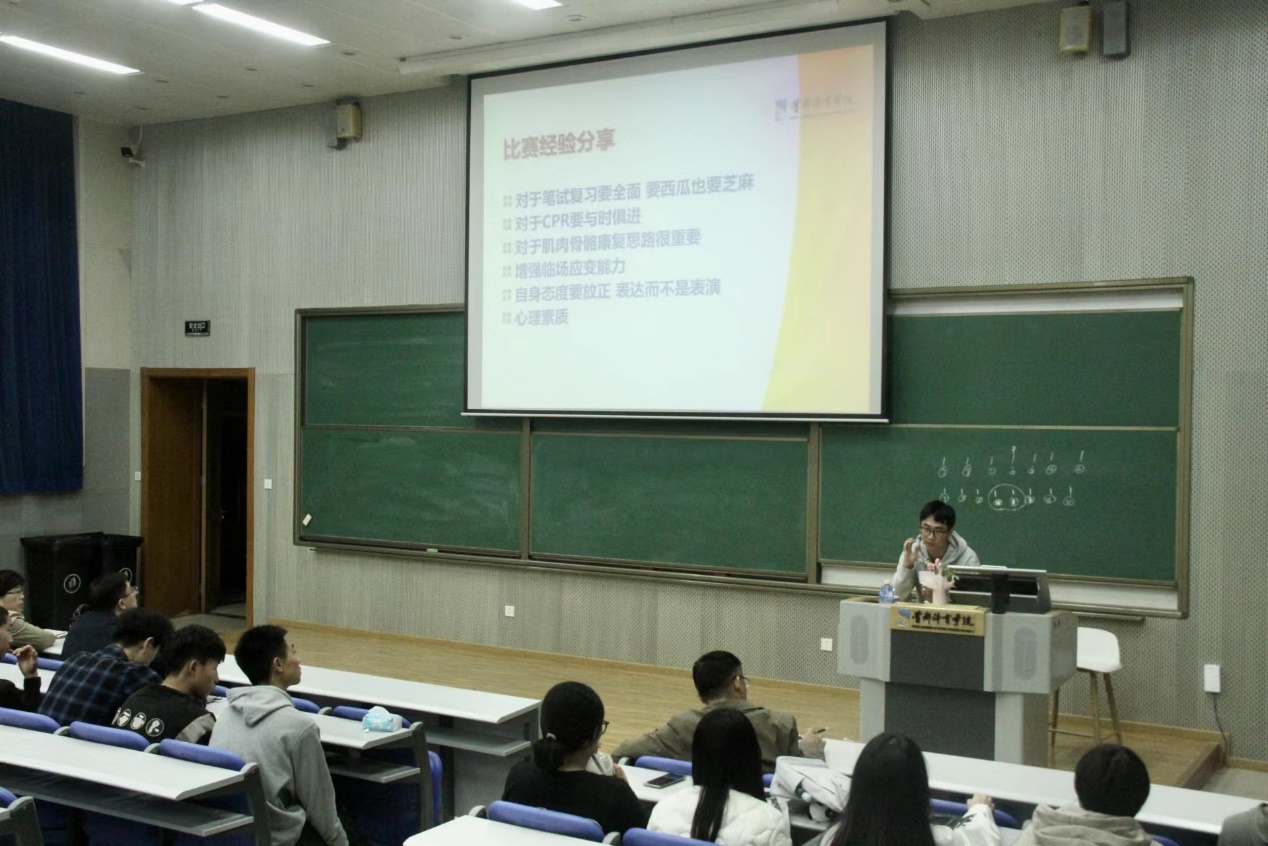 首先,代表我校参加比赛的六名选手——运动康复专业2020级李伯尧、唐一鸣、李晓静、何永杭、韦美、崔嘉怡和所有师生见面,李伯尧、唐一鸣、崔嘉怡三位同学分别从“备赛经历、比赛内容、比赛过程、比赛感悟”等方面,就参加集训和在比赛过程中获得的经验、体会做了详细的汇报,为低年级同学将来参加比赛提供了有益的参考。接着,董静副书记代表学院对代表队取得的优异成绩表示了祝贺,并对继续巩固学院良好学风进行了强调,对迎接即将到来的本科教育教学审核评估工作进行了布置。最后,贺刚院长强调,本届技能大赛的成果非常的来之不易,大赛汇聚了来自全国各地的优秀学子,为大家搭建了一个展示才华的平台,培养了学生的创新精神和实践能力,让不同角度的思想汇聚在此,碰撞出交流的火花,希望各年级同学加强专业学习、增强综合素质,能在以后的各种专业比赛中见到运康学子的身影。